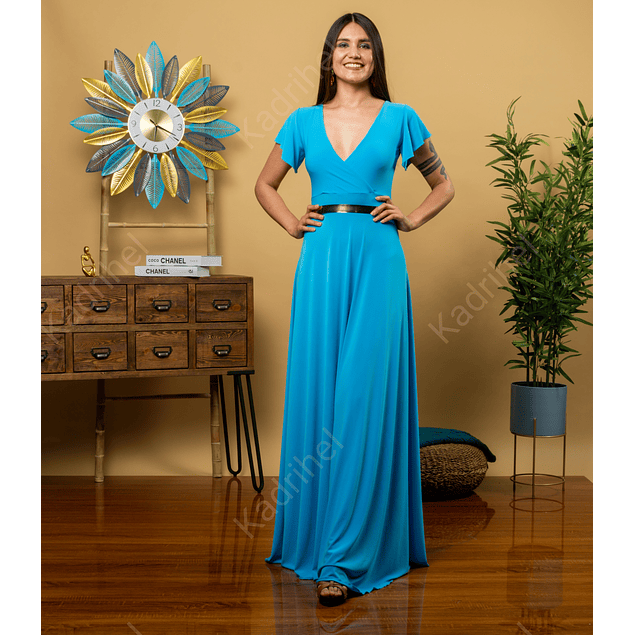 Vestido Largo Cruzado En Escote Mangas Con Vuelos Ideal Para Fiesta Gala Matrimonio. (NO INCLUYE CINTURON) MODELO ADARA TURQUEZA